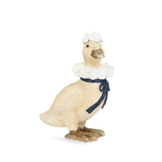 Denna söta ankunge med kråskrage och rosett runt halsen samt en rosenkrans på huvudet blir en vacker dekoration till fönstret eller soffbordet. Passar lika bra under påsken som året runt för en unik och lantlig inredning.