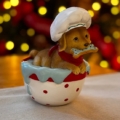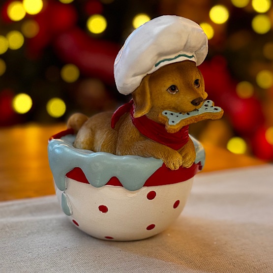 Skapa en lekfull och söt julstämning med dessa charmiga figurer föreställande en hund och en katt i skål. Perfekta som dekorativa inslag i köket, på fikabordet eller som en del av juldukningen. Välj mellan två varianter: hund med blåprickig skål och katt med rödprickig skål. Säljs styckvis.
