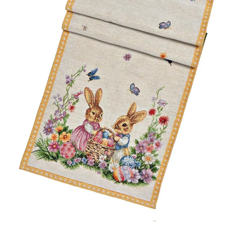 En dekorativ bordslöpare med ett detaljerat motiv av kaniner, blommor och små vårtecken som ger dukningen ett mjukt och inbjudande uttryck. Perfekt för påskbordet eller som en säsongsdetalj som ger liv åt matbordet, sideboardet eller soffbordet.