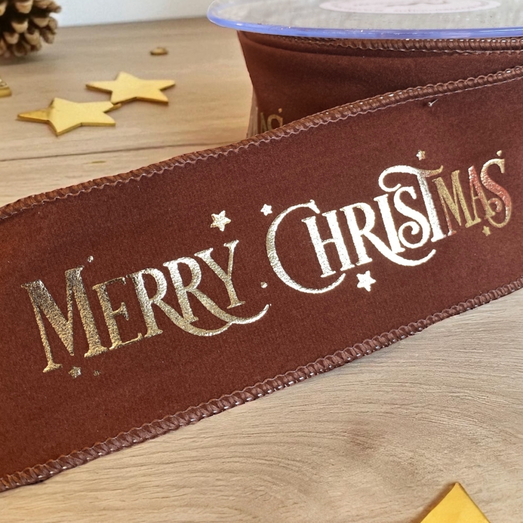 Dekorationsband med brun sammetsyta och guldtext “Merry Christmas”.