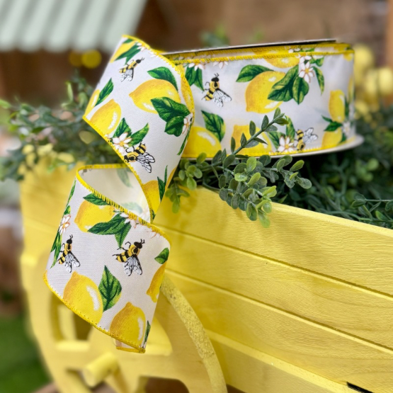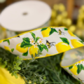 Svart- och gulrandiga honungsbin surrar mellan grenar fyllda med citroner, vita blommor och frodiga gröna blad på detta vita satinband. Perfekt band till sommarens firanden och dukningar.