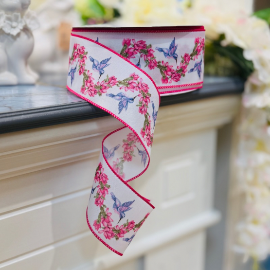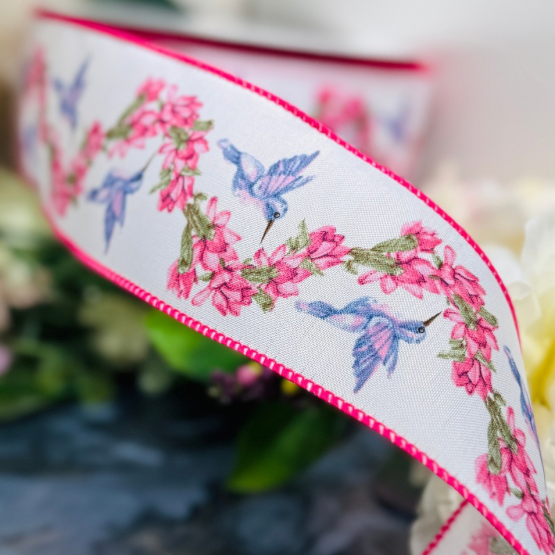 Lavendellila kolibrier svävar lätt runt en blomstergirlang i rosa och grönt på detta polyesterband med vävd linnestruktur. De små fåglarna har svarta, pärlglänsande ögon och bruna näbbar, och är placerade i växlande riktningar – alltid vända mot den slingrande girlangen.