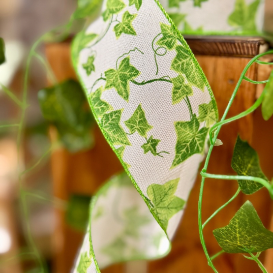 Murgrönerankor i frisk vårgrön ton slingrar sig mjukt över detta vita band och skapar ett levande, naturnära uttryck. Det naturinspirerade mönstret gör bandet perfekt för presentinslagning, blomsterarrangemang, dukningar och kreativa DIY-projekt.