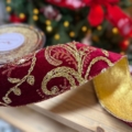 Exklusivt dekorationsband med vinröd sammetsyta och broderat guldmönster. Bandet är 6,7 cm i bredd och är tjockt med ordentlig styrsel. Detta band finns även i bredden 10 cm. Observera att på grund av dess tjocklek är en hel rulle av detta band 4,5 meter.