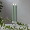 2-pack grönt antikljus i Star Tradings Flamme Stripe serie, gjorda i vax i med en räfflad-randig yta. Ljusen har en mycket naturtrogen låga som lyser med varmvitt sken. De har timerfunktion vilket gör att ljusen lyser i 6h per dag i ca 30 dagar. De drivs av 2 AAA batteri för varje ljus, dessa ingår ej. Dessa ljus har en silikonbelagd fot som gör att ljusen står stadigare i ljushållaren. Undvik att ställa ljusen i direkt solljus då de kan smälta och missfärgas av värmen.