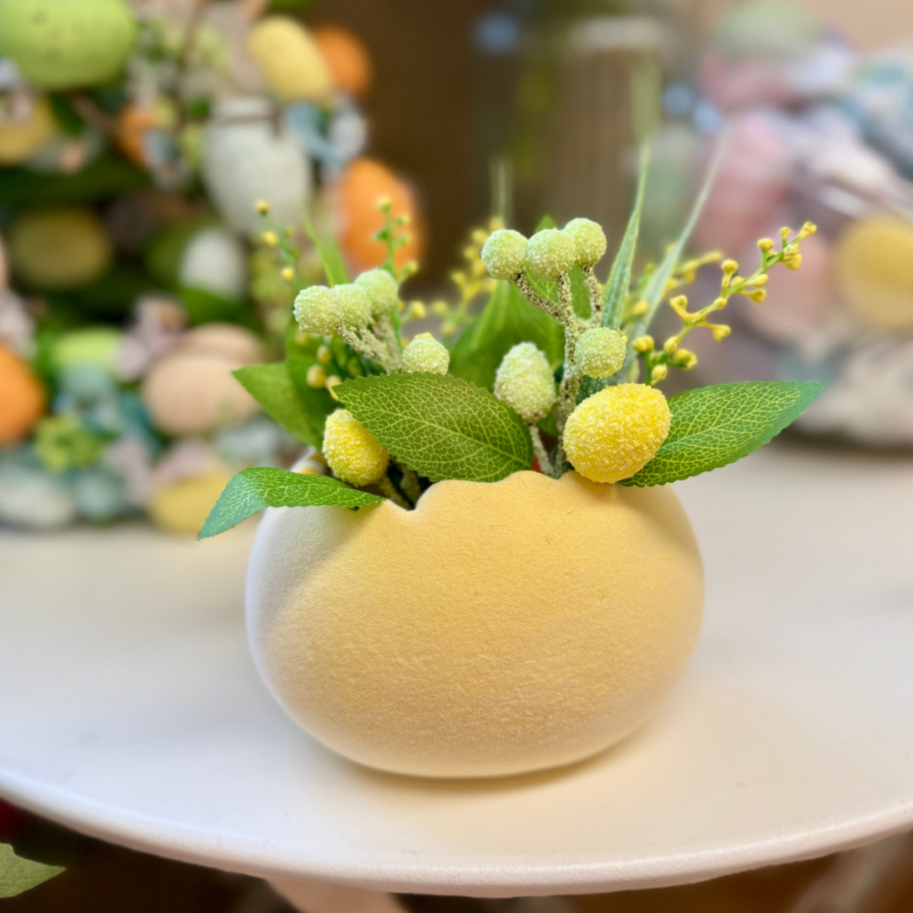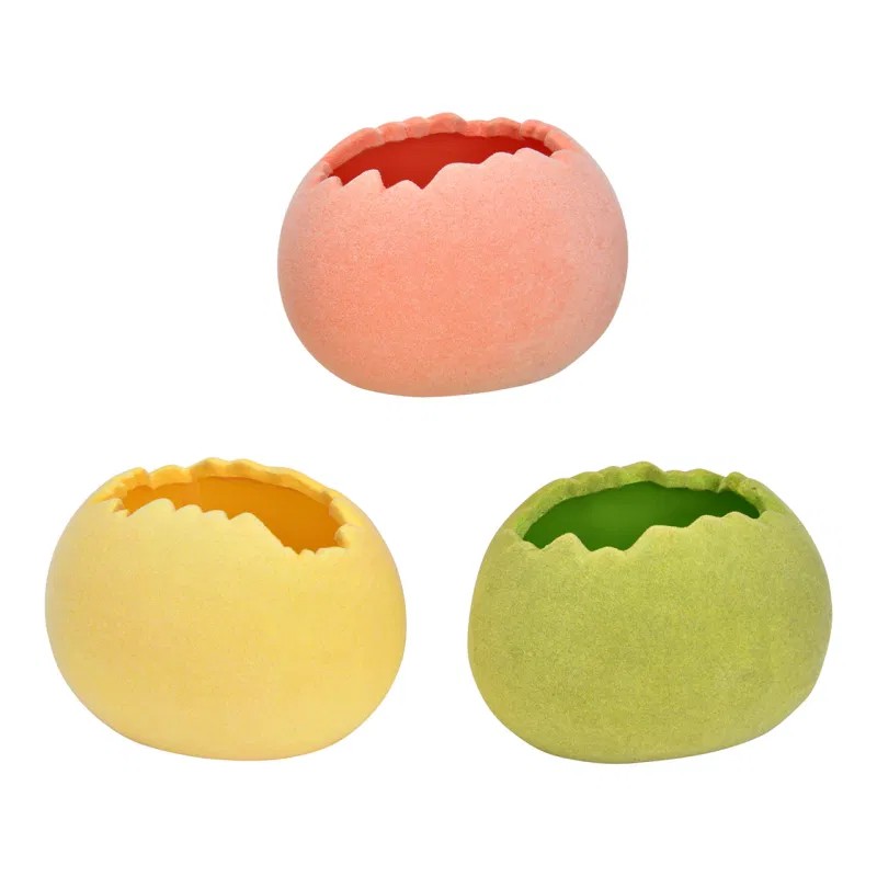 En dekorativ skål i keramik formad som ett sprucket ägg som ger ett lekfullt och vårigt uttryck. Perfekt för påskgodis, småsaker eller som en färgstark detalj på bordet eller i ett stilleben. Lätt att kombinera med andra säsongsdekorationer.