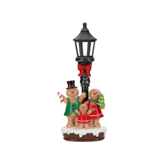 Skapa en varm och lekfull julstämning med denna charmiga pepparkaksfamilj som samlats vid en klassisk svart lyktstolpe dekorerad med en röd rosett. Figuren är full av detaljer: pappan håller en polkagris, mamman en julgran och den lilla pepparkaksbarnet står glatt mellan dem. Basen är täckt av ett ”snötäcke” som ger figuren en vintrigt söt känsla. Lyktan är batteridriven