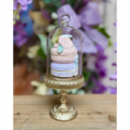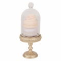 En festlig prydnad i form av macarons som ligger på ett vackert guldfat. Bakverken täcks av en glaskupa som ger en elegant känsla. Perfekt dekoration till våren och påskfirandet.