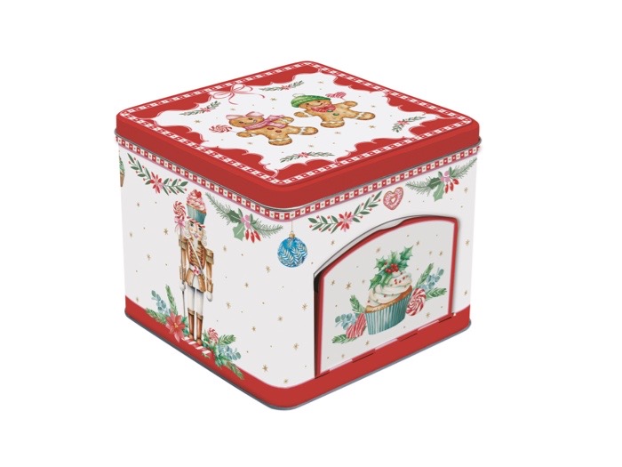 En söt och praktisk plåtburk med juligt motiv från Sweet Christmas-serien. Burken är dekorerad med pepparkaksfigurer, nötknäppare och festliga detaljer i rött, grönt och guld. Den har en smart öppning framtill som gör det enkelt att komma åt godsakerna – perfekt för pepparkakor, godis eller små bakverk. En charmig detalj i köket eller på fikabordet under julen.