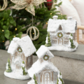 Små snötäckta hus som tillsammans skapar en idyllisk vinterby. Varje hus är dekorerat med kransar och granar, vilket ger en levande och mysig känsla. Perfekt att ställa på fönsterbrädan, hyllan eller som del av en julby. Säljs styckvis, välj mellan huset med en skorsten (till vänster), Två skorstenar (i mitten) eller utan skorsten (till höger).