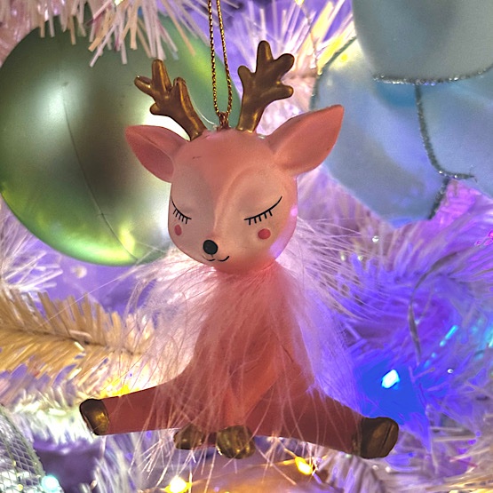 Sötaste julgranshänget i form av en sittande ren med guldhorn och fluff runt halsen. Välj mellan rosa och brun, 99 kr/styck.