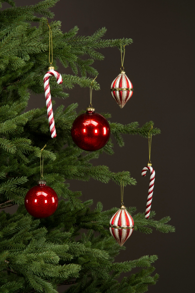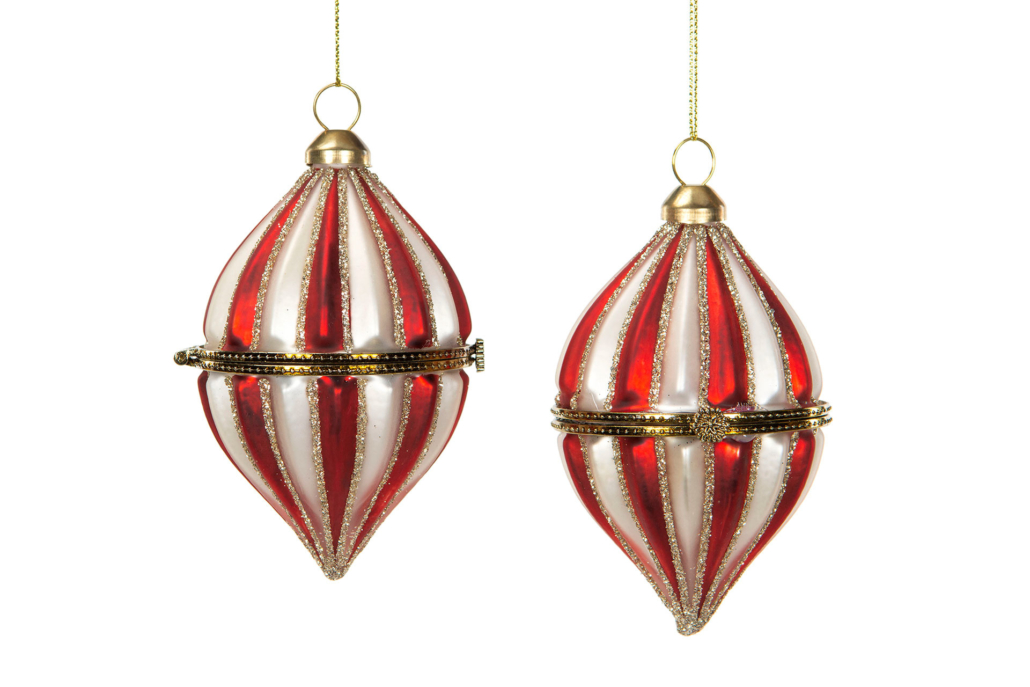 Två glaskulor med randig design i rött, vitt och guldglitter. En elegant och klassisk dekoration som ger granen en exklusiv känsla. Kulorna har öppningsbar funktion och kan även användas som små presentaskar.