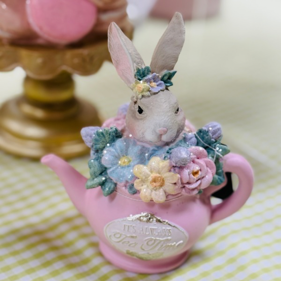 Söt dekorfigur i polyresin föreställande en söt kanin som sitter i en tekanna. Fina detaljer och mjuka färger gör den till en underbar dekoration i hemmet. Perfekt som present, påskdekoration eller för att skapa en mysig atmosfär året om.