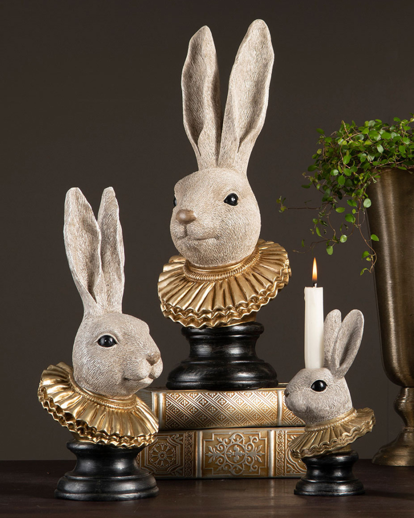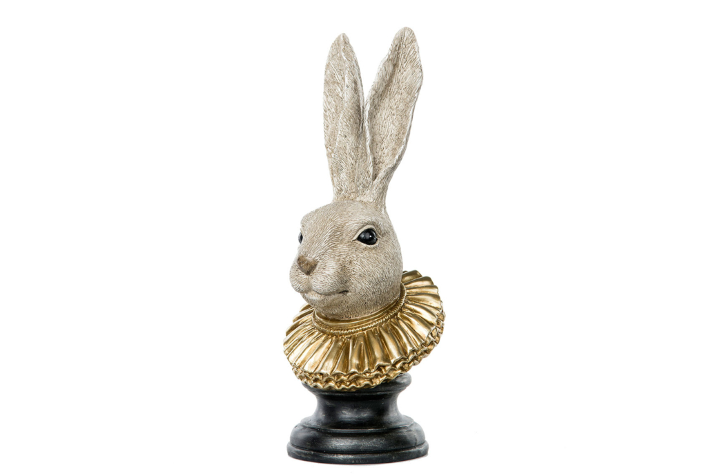 Detta kaninhuvud med stor krage blir ett fint tillskott på fönsterbrädan eller på ett soffbord.