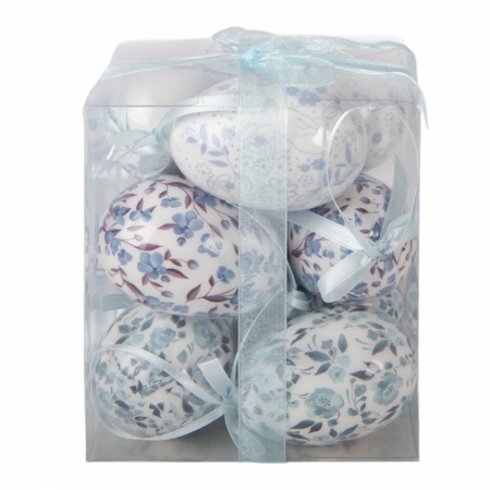 Vitt keramikägg dekorerat med små blå blommor, ståendes på en detaljerad blå fot. En romantisk och elegant prydnad som sprider påsk- och vårkänslor i hemmet. Perfekt som ett vackert blickfång på påskbordet.