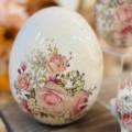 Ett vackert dekorationsägg i keramik med romantiskt blommönster och lätt krackelerad yta som ger ett mjukt, tidlöst uttryck. Perfekt som påskdekoration men även fin att använda som en del av ett vårigt stilleben. Passar lika bra på ett sideboard som på ett dukat bord.