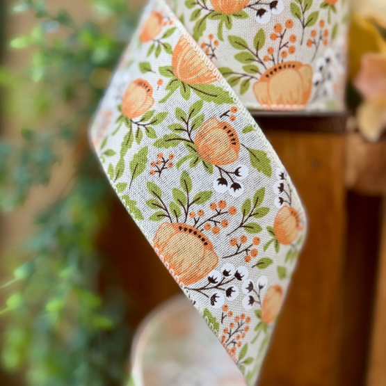 Detta elfenbensfärgade band i fusklinne pryds av ett romantiskt mönster med pioner i persika och ljus korall, dekorativa bär, salviagröna blad och vita bomullskvistar. Den mjuka färgskalan ger ett harmoniskt och elegant uttryck som passar lika fint till bröllop och festliga dukningar som till presentinslagning, kransar och blomsterarrangemang med en varm, lantlig känsla.