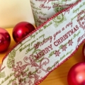 Naturfärgat dekorband i jutematerial, prytt med grönt och rött motiv av julkortshälsningar som “Merry Christmas” och frimärken.