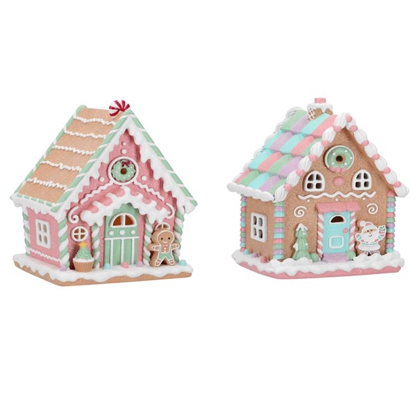 Pepparkakshus dekorerat med godis i härliga pasteller. Finns i två varianter; rosa och brun. 799 kr/styck.