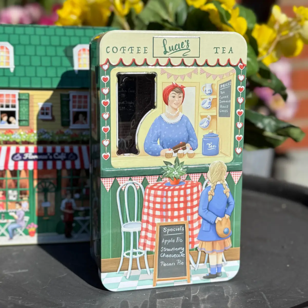 Plåtburk med präglat motiv av en gammaldags tebutik där även insidan har ett fint motiv.