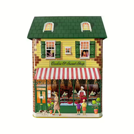 En charmig plåtburk formad som ett klassiskt markishus, dekorerad med en nostalgisk vintermiljö där en färgstark godisbutik står i centrum. De detaljerade illustrationerna gör burken till en vacker prydnad i sig och en praktisk förvaring för julgodis, kakor eller små presenter. Perfekt för att sprida en känsla av gammaldags julstämning i köket eller vardagsrummet.