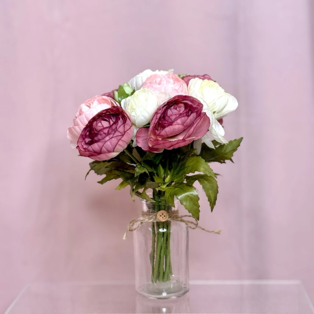 Denna konstgjorda ranunkelbukett är en färdig och genomtänkt bukett som gör det enkelt att snabbt skapa en vacker dekoration. Perfekt för dig som vill ha ett stilfullt uttryck utan att behöva arrangera blommorna själv. Placera den direkt i en vas. Buketten håller sig vacker året om och kräver varken vatten eller skötsel.
