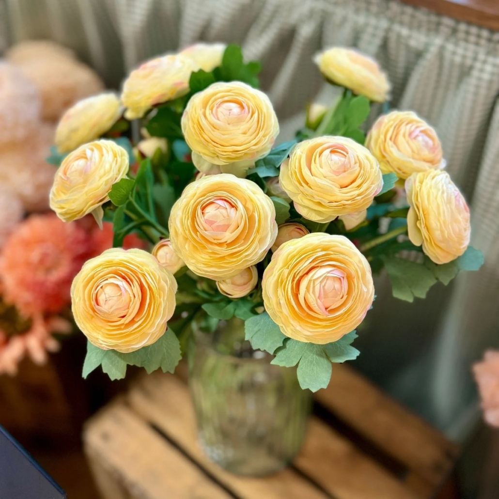 Den här konstgjorda ranunkeln med smörgula blad är den perfekta detaljen för att liva upp ditt hem. Kvisten är lika fin i en enkel vas som när den kombineras med andra konstgjorda snittblommor. Var kreativ och sätt ihop en bukett med olika blommor i härliga färger.