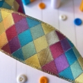 Unikt dekorband med glansigt material med ett flerfärgat diamantrutigt mönster. Baksidan av bandet är guldigt med en glansig yta. Detta band är tjockt och har ordentlig styrsel och på grund av dess tjocklek är en hel rulle av detta band 4,5 meter.