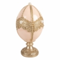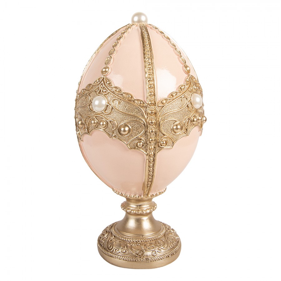 Ett elegant och sagolikt påskägg som blir ett exklusivt blickfång i vårens dekorationer. Det mjukt rosa ägget pryds av rikt ornamenterade gulddetaljer och pärlliknande dekorationer som ger ett lyxigt, nästan kungligt uttryck. Den dekorativa foten gör att ägget står stadigt och passar perfekt på ett sideboard, i ett fönster eller som mittpunkt i ett påskarrangemang.
