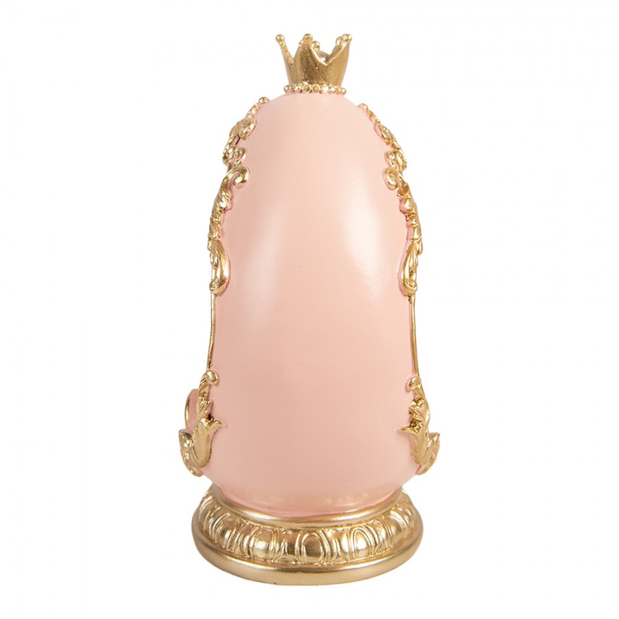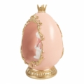 Ett sagolikt dekorationsägg som för tankarna till en romantisk och lekfull påskvärld. Inuti det mjukt rosa ägget sitter en liten kanin med rosett, inramad av dekorativa gulddetaljer och krönt med en elegant krona upptill. Kombinationen av pastelltoner och guld ger ett exklusivt men samtidigt mjukt uttryck.