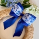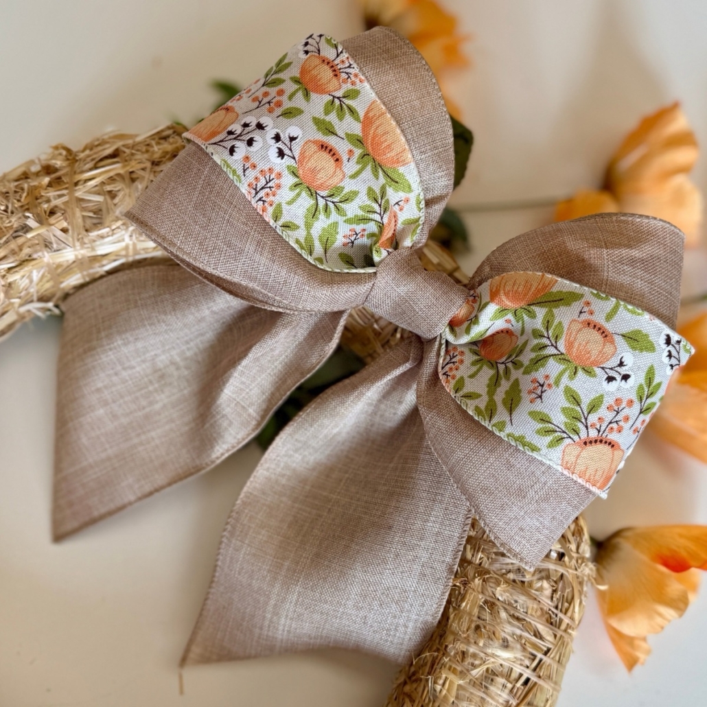En effektfull handknuten rosett med tre generösa loopar som verkligen drar blickarna till sig. Genom att kombinera två olika band skapas ett levande och dekorativt uttryck som ger rosetten extra karaktär. Det aprikosfärgade mönstret med pioner passar perfekt till vårens och sommarens dekorationer.