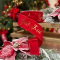 Dekorationsband med röd sammetsyta och guldtext “God Jul”.