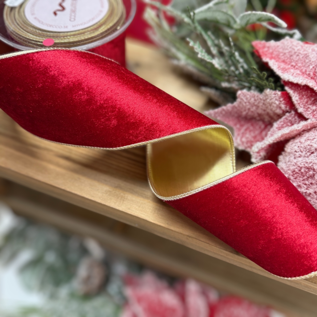 Exklusivt rött dekorband med sammetsyta och en glansig baksida i guldfärg. Detta band är tjockt och har ordentlig styrsel och passar utmärkt till att skapa ”banners” i julgranar, kransar och girlanger, dvs. klippa ut en mindre remsa och fästa. Observera att på grund av dess tjocklek är en hel rulle av detta band 4,5 meter.