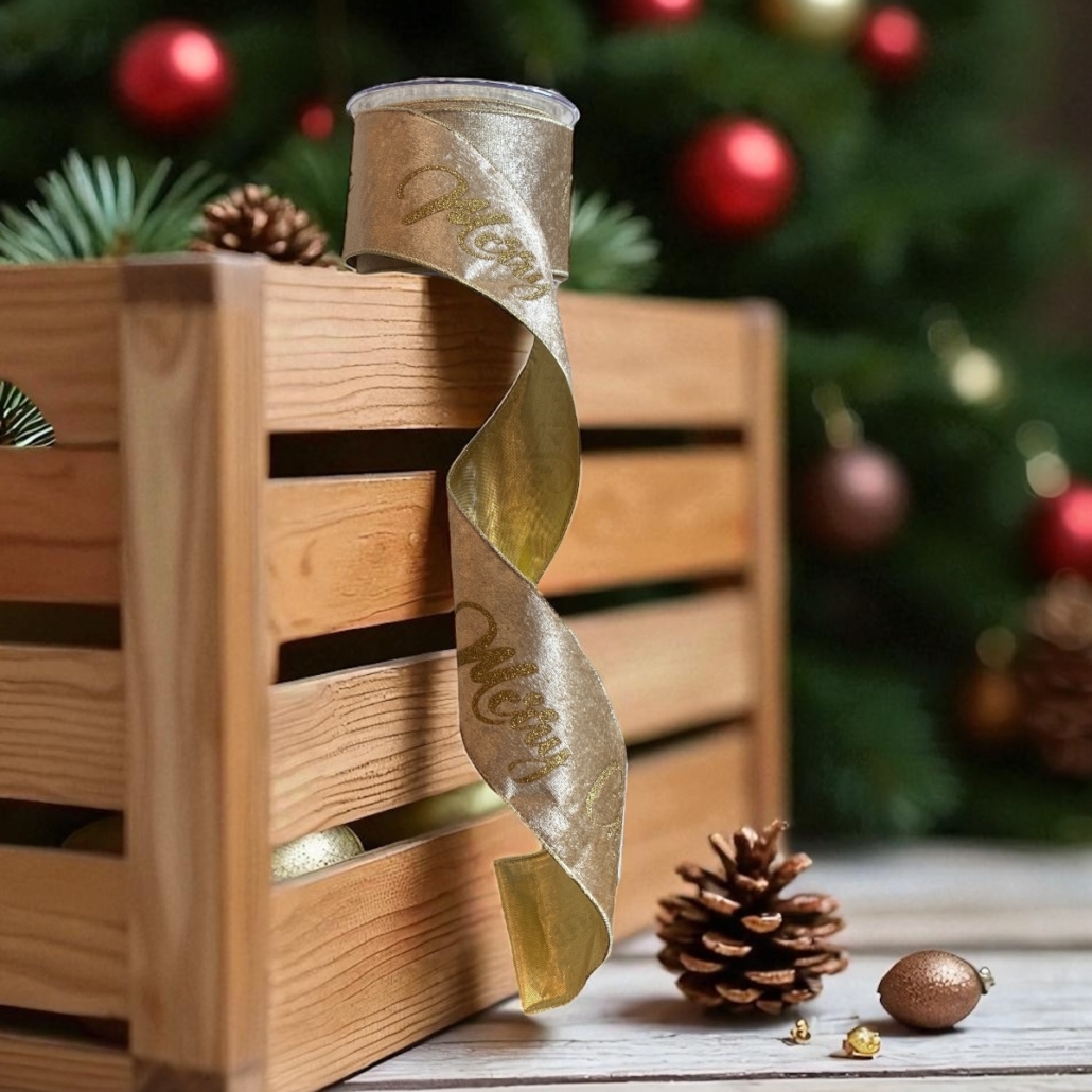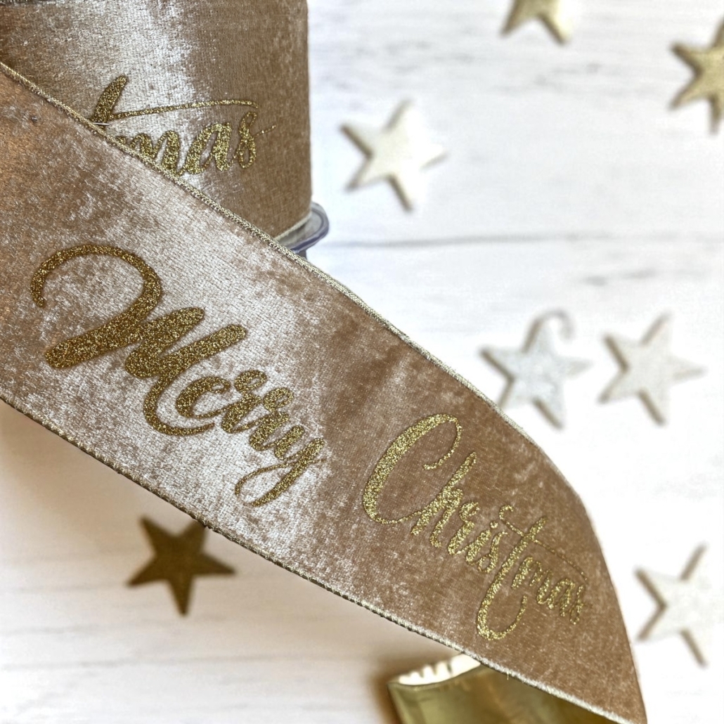 Exklusivt beige dekorationsband med sammetsyta och kursiva bokstäver i guld. Detta band är tjockt och har ordentlig styrsel och passar utmärkt till att skapa “banners” i julgranar, kransar och girlanger, dvs. klippa ut en mindre remsa och fästa. Observera att på grund av dess tjocklek är en hel rulle av detta band 4,5 meter.