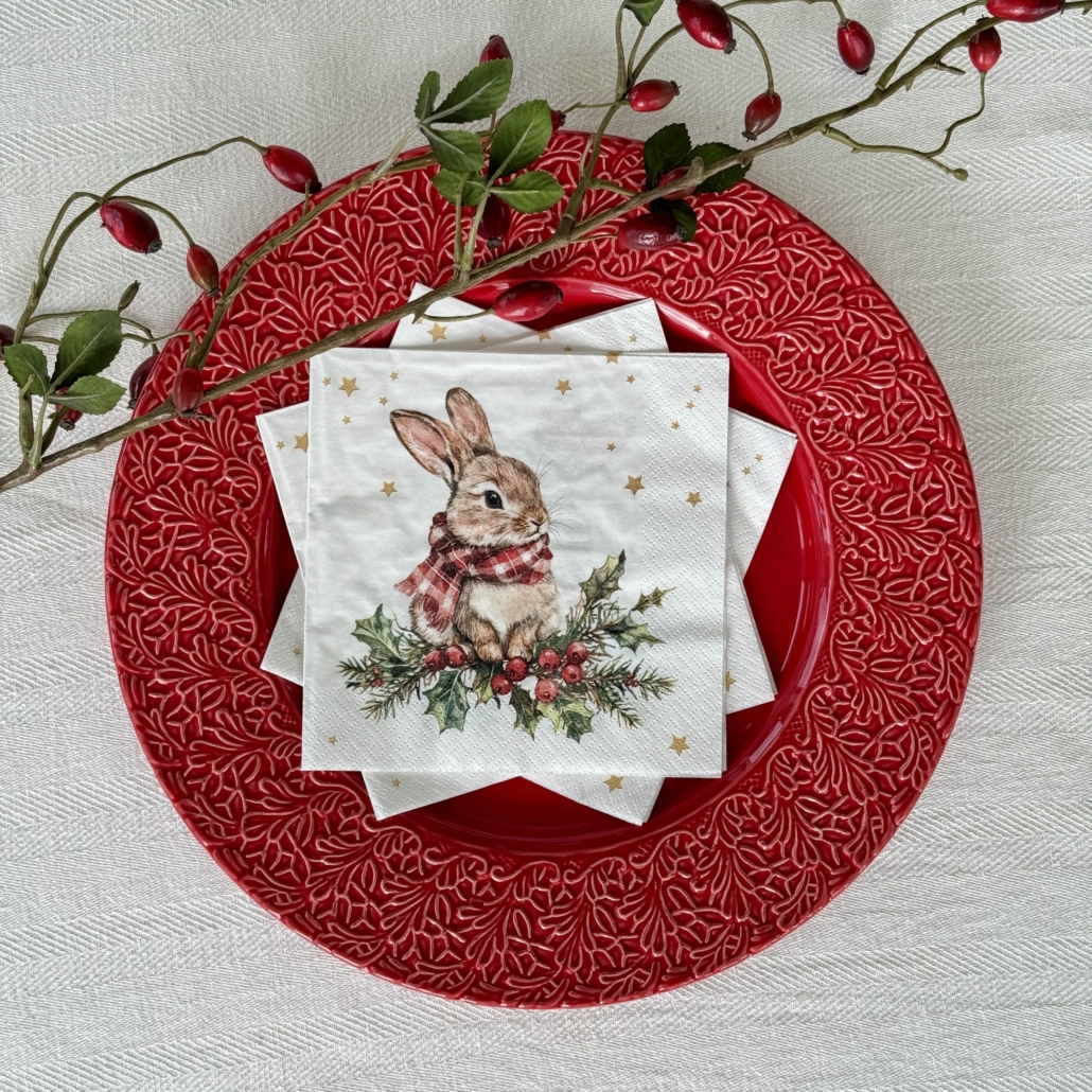 Skapa en varm och inbjudande dukning med denna servett. Motivet visar en söt kanin insvept i en rutig halsduk, omgiven av järnek, röda bär och gyllene stjärnor, perfekt för vinterns och julens festligheter. Servetterna är både dekorativa och praktiska.