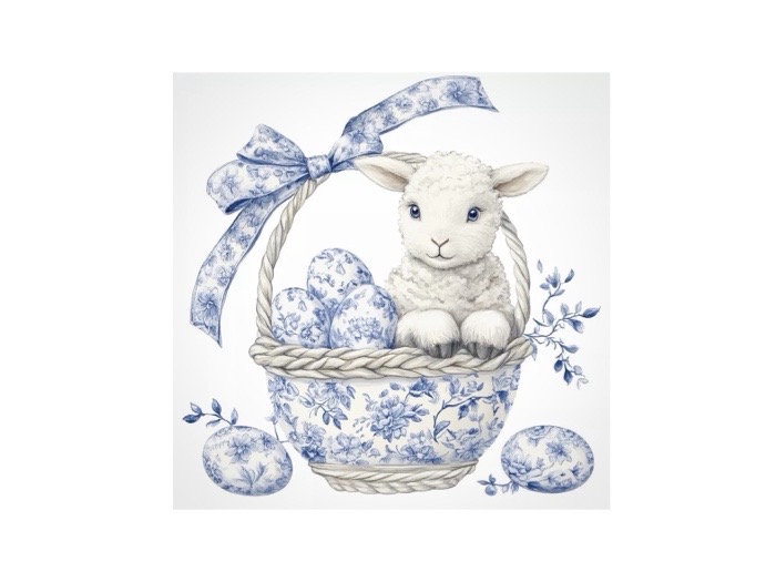 En dekorativ servett med ett sött lamm i en blåvit mönstrad korg, omgiven av påskägg, blommor och en rosett i romantiskt, klassisk stil.