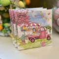 Servett med påskmotiv som föreställer en lastbil full med blommor, ägg och påskdekorationer på flaket.