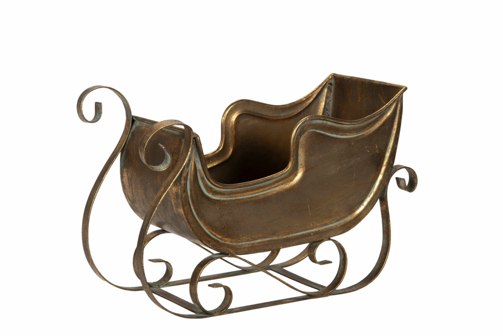 En dekorativ metallsläde i antik mässingsfinish. Med sina fina böljande detaljer blir den en vacker juldekoration som kan användas ensam eller fylld med granris, paket eller andra pyntade inslag. Finns även i större storlek.