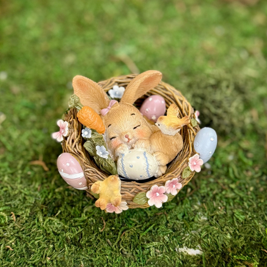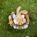En söt dekorationsfigur med en liten kanin som vilar i ett bo, omgiven av ägg, blommor och små detaljer som ger ett mjukt och lekfullt uttryck. Perfekt som påskdekoration eller som en fin detalj i ett stilleben på bordet eller hyllan.