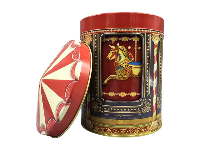 Plåtburk i metall med inbyggd speldosa och ett dekorativt motiv av karusellhästar som för tankarna till klassiska tivolin. När du skruvar upp speldosan under burken spelas melodin Nocturne, samtidigt som bakgrundsbilden med karusellhästar snurrar runt som en liten karusell. En vacker burk som fungerar både som praktisk förvaring och som en unik gåva.