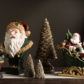 Dekorativ tomte i klassisk stil, sittande i en grön släde med vackra gulddetaljer. Tomten håller en julkrans och är omgiven av presenter, en gran och en liten nalle – allt i härligt traditionella julfärger. En stämningsfull dekoration som sprider värme och glädje, perfekt att placera på en hylla, i fönstret eller som blickfång på julbordet.