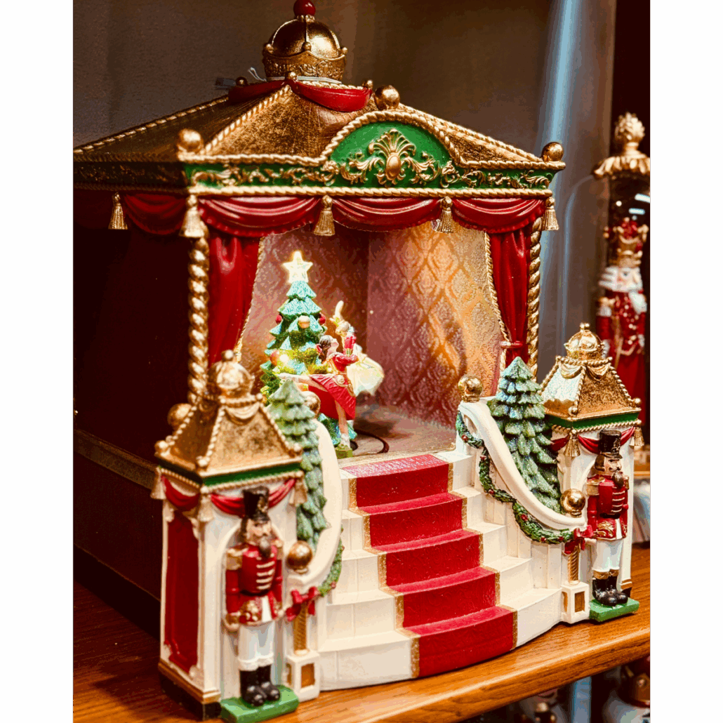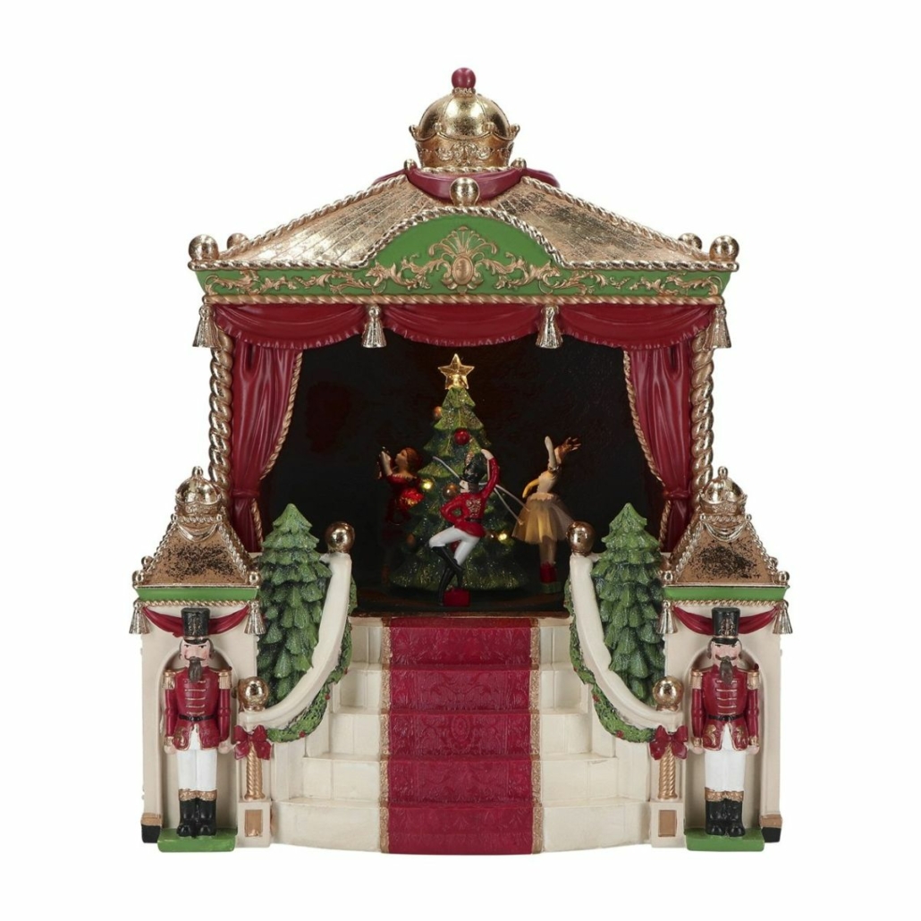 Exklusiv julprydnad i form av en teater med scen som föreställer den klassiska nötknäpparbaletten. Scenen är inramad av en grön och guldskimrande teaterfront med röda draperier, flankeras av två nötknäpparsoldater och pryds med julgranar och dekorationer. Teatern ansluts till vägguttag med adapter och spelar nötknäpparmarchen medans figurerna rör sig på scenen.