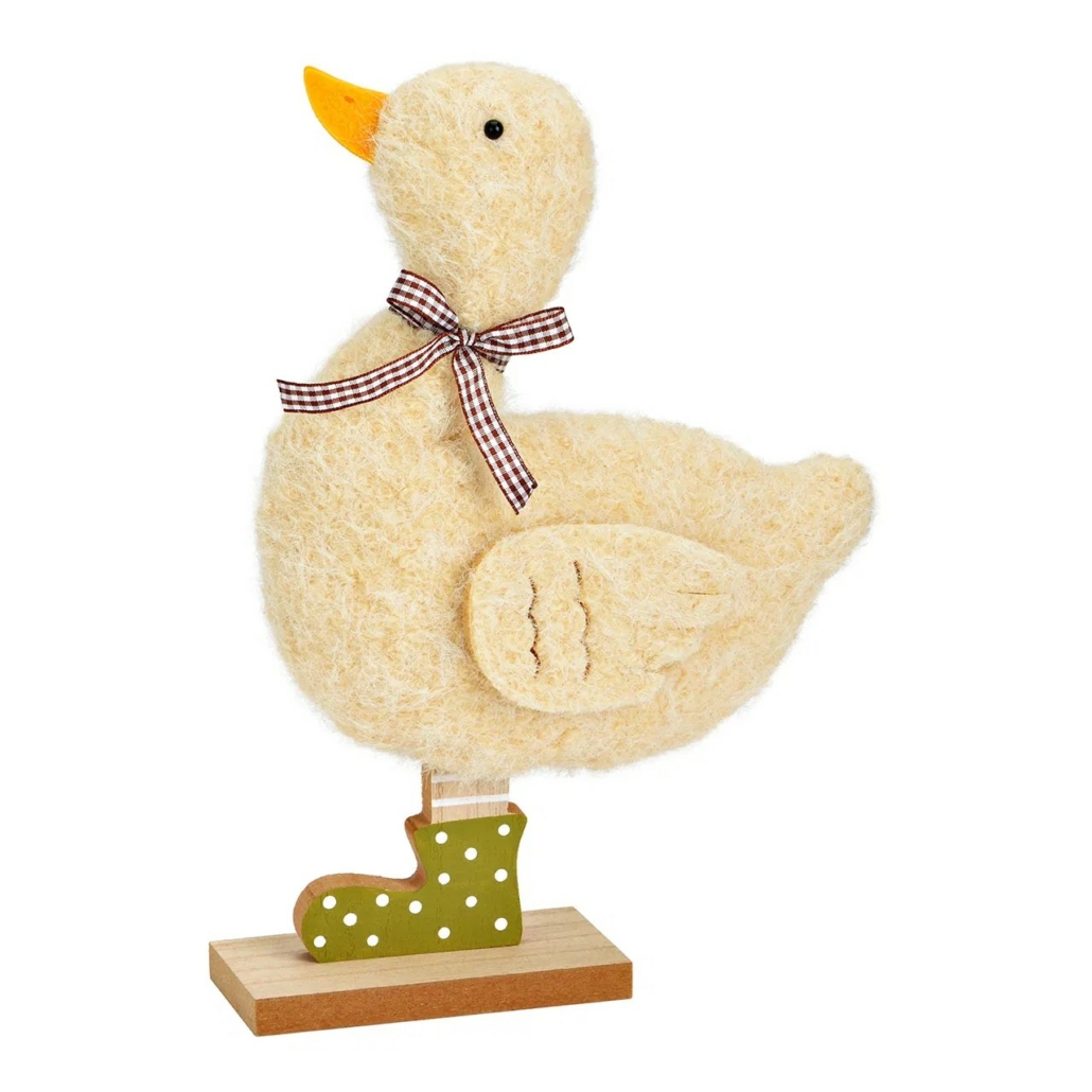 En dekorativ anka med mjuk, textilklädd yta och fina detaljer som ger ett varmt och lekfullt uttryck. Den nättare höjden gör den lättplacerad och perfekt som påskdekoration eller som en vårig detalj i köket, hallen eller på en hylla. Står stadigt på en träfot.