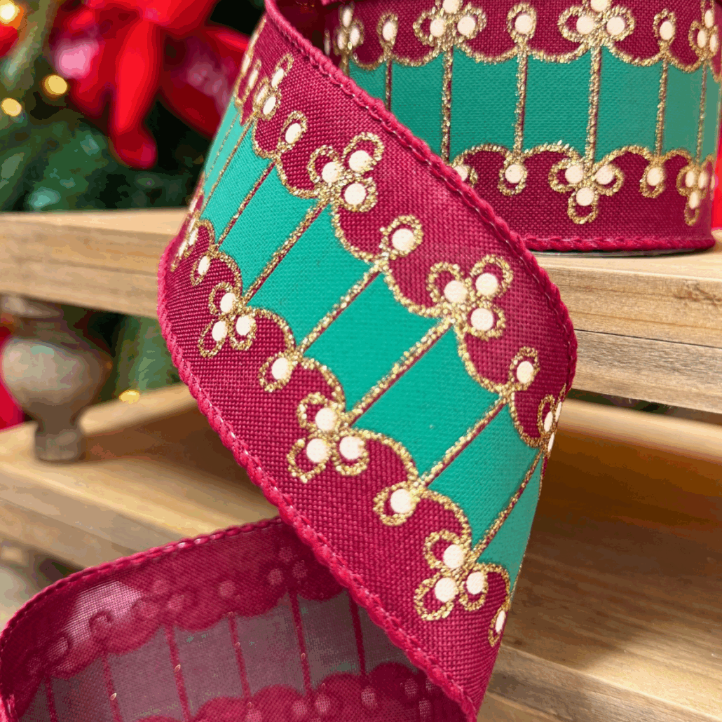 Vinrött dekorationsband med ett vackert grönt mönster med guldglittriga detaljer runt om.