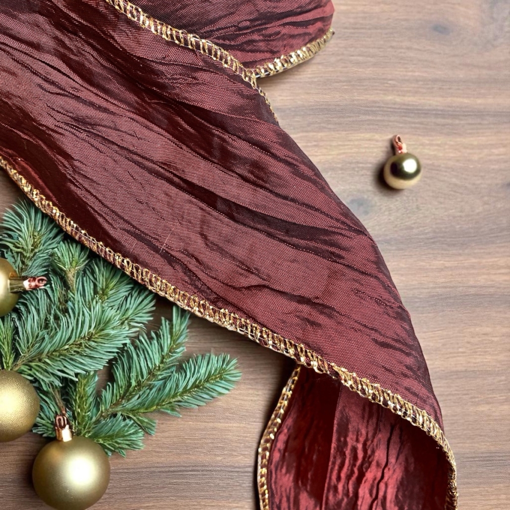 Elegant dekorband i vinröd krinklad satin och guldfärgade kantsömmar.