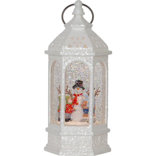 Glittrande, vattenfylld lykta med snögubben och hans vänner inuti. Glittervätskan är i rörelse när produkten är påslagen, och lyser fint. Placera på ett bord eller en hylla för en härlig julstämning.