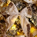 Vacker vit sammetsrosett kantad med paljetter och glitter i guld. Baksidan har guldfärgad tråd för upphängning.