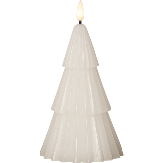 Batteridrivet vitt blockljus format som en gran. Toppen har en naturtrogen låga med mysigt varmvitt sken.